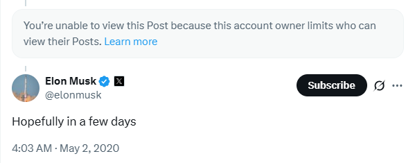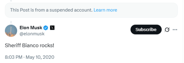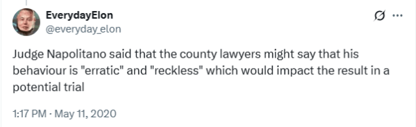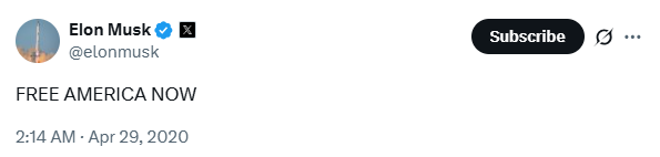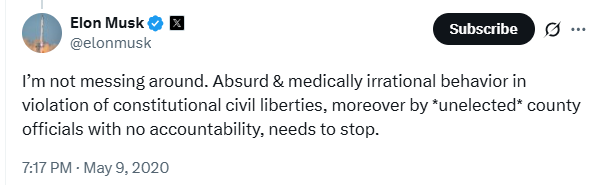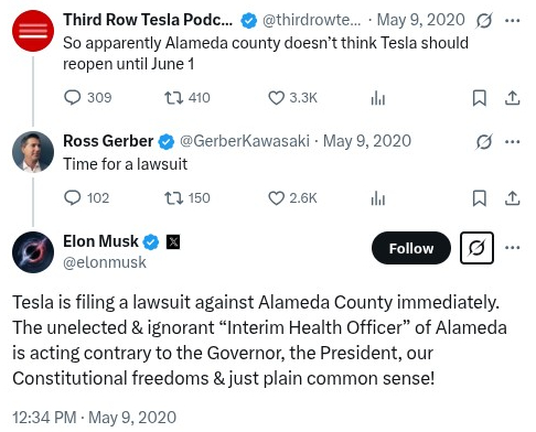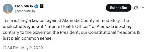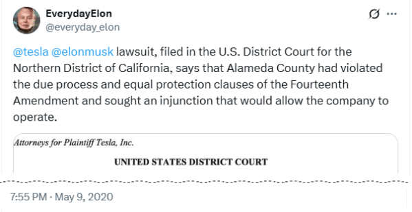 Frustrated by COVID restrictions and a delayed factory re-opening, Musk announces via Twitter that he will be filing a lawsuit against Alameda county.