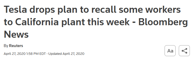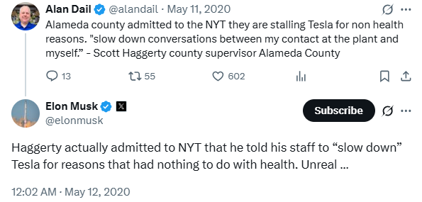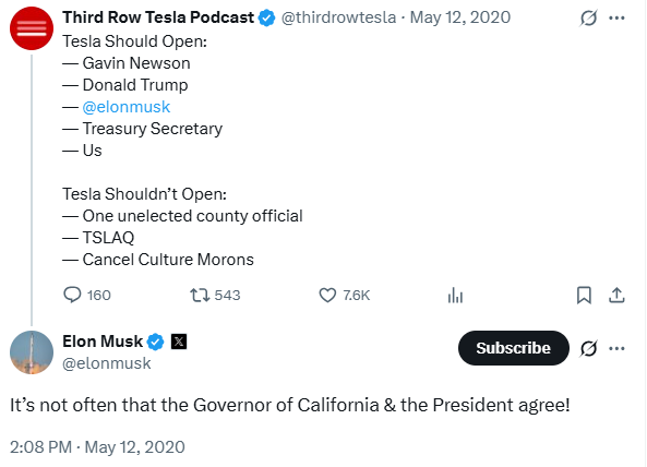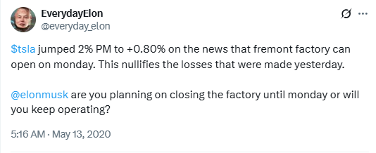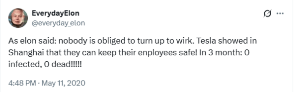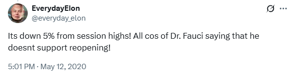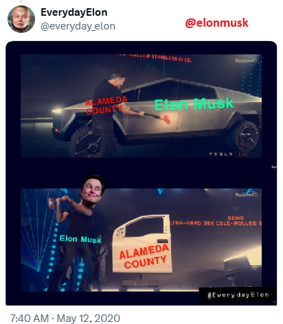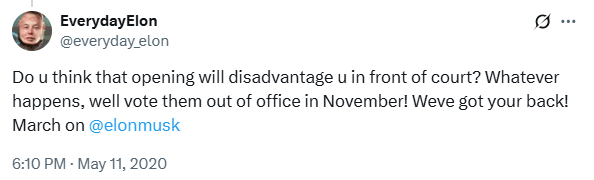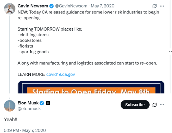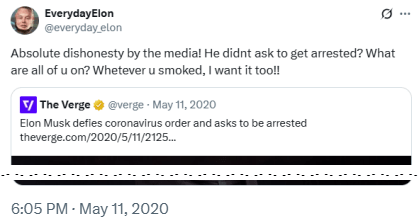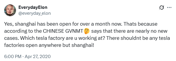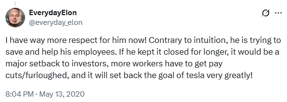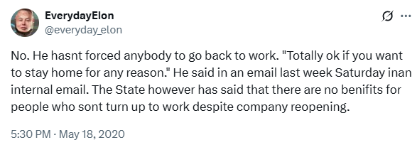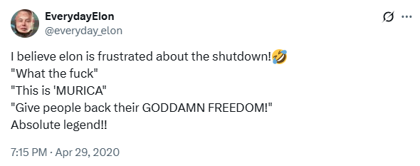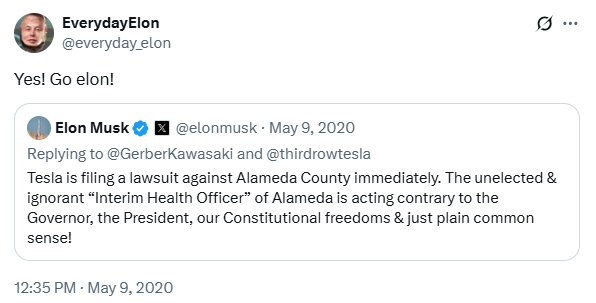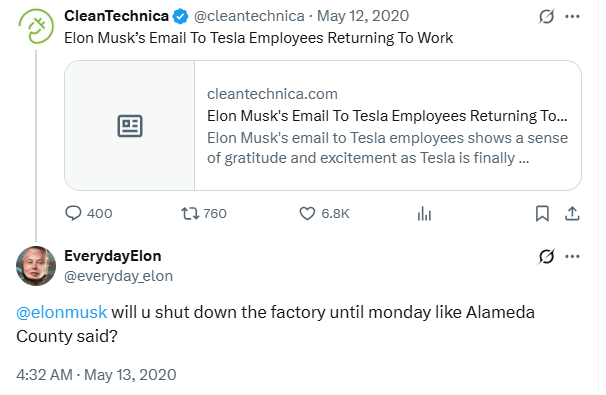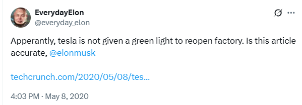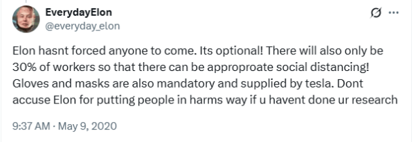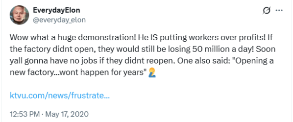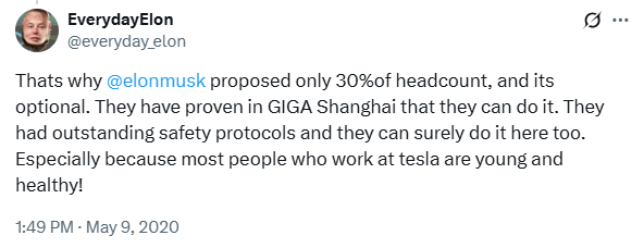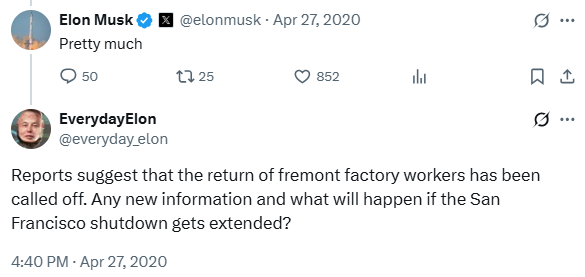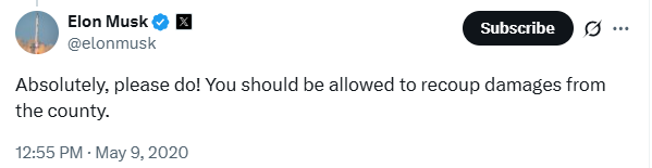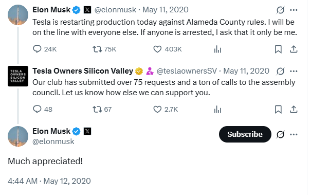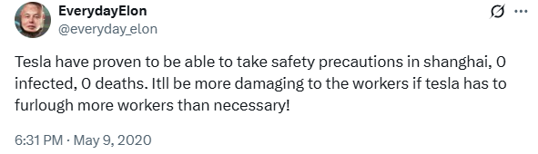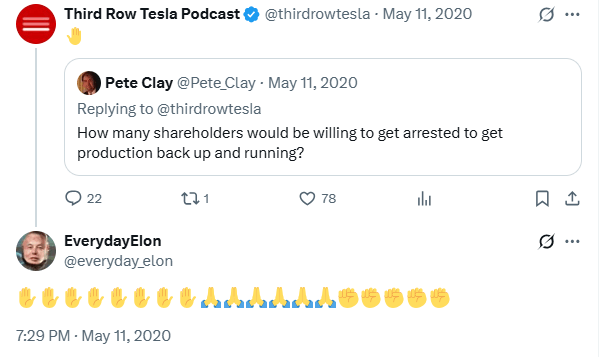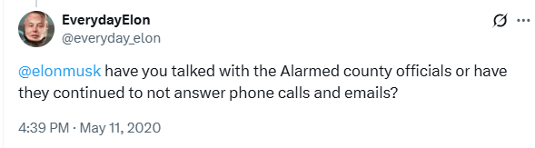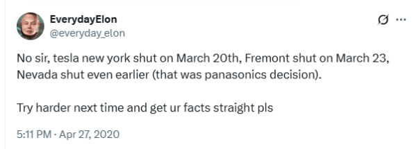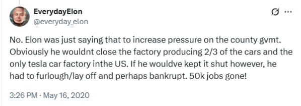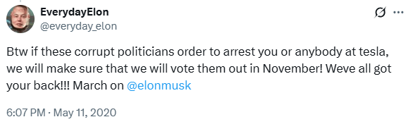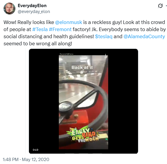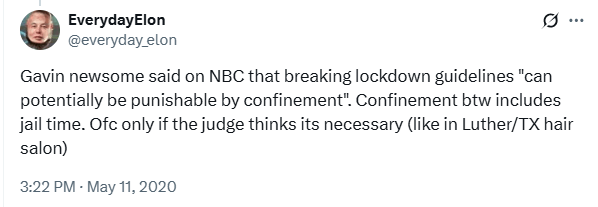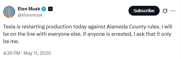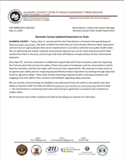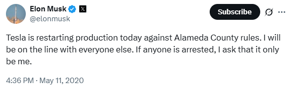 4:36 PM – Tesla restarting production. “If anyone is arrested, I ask that it only be me.”