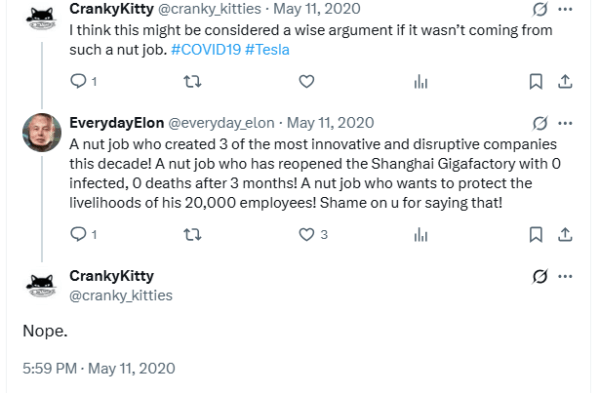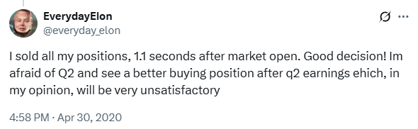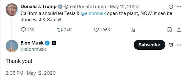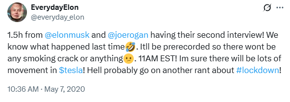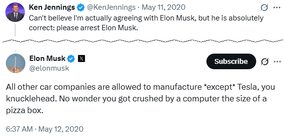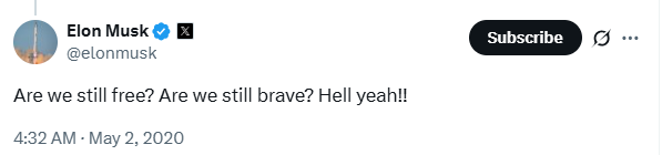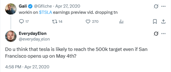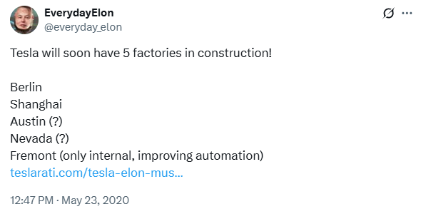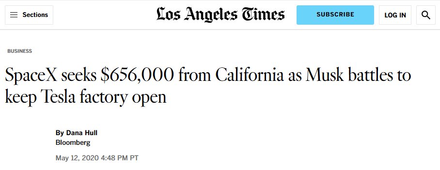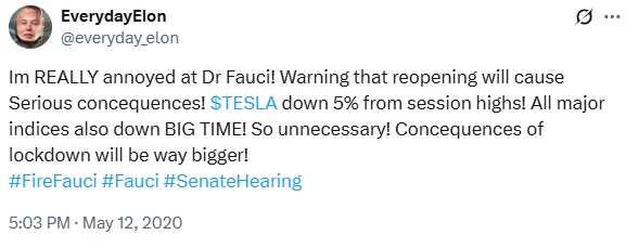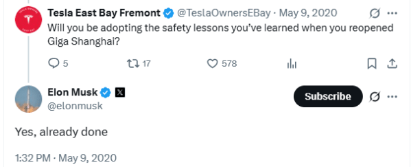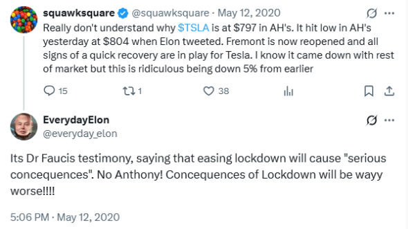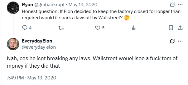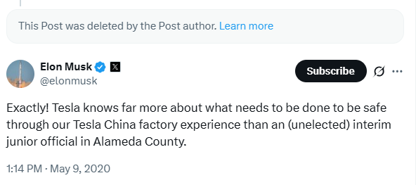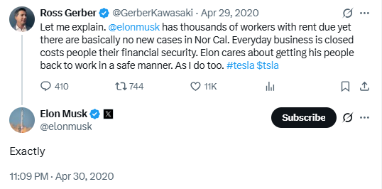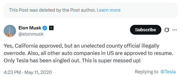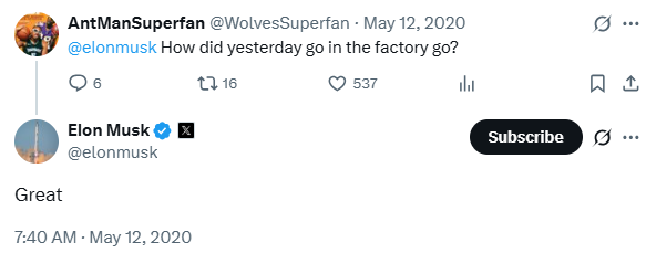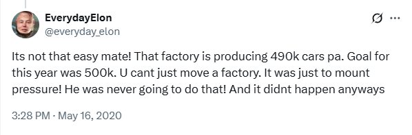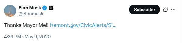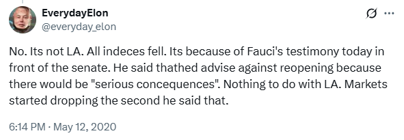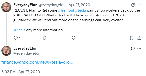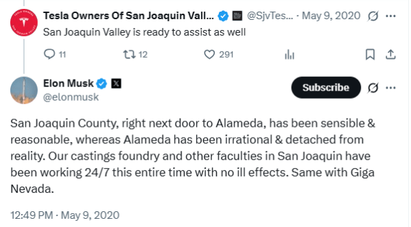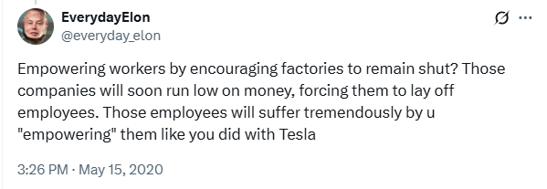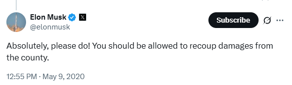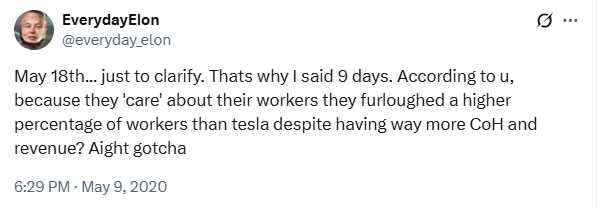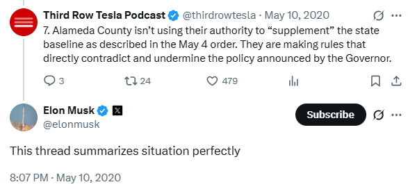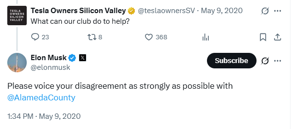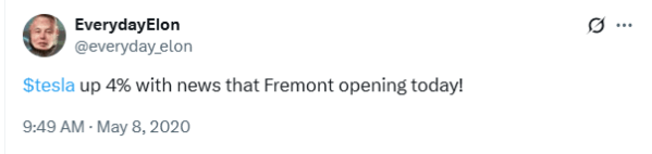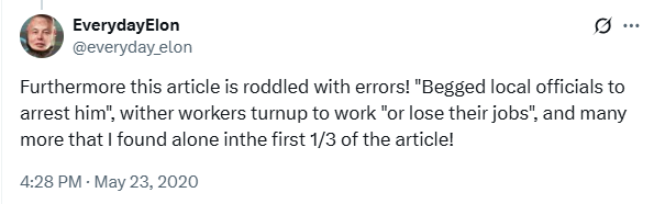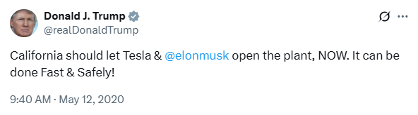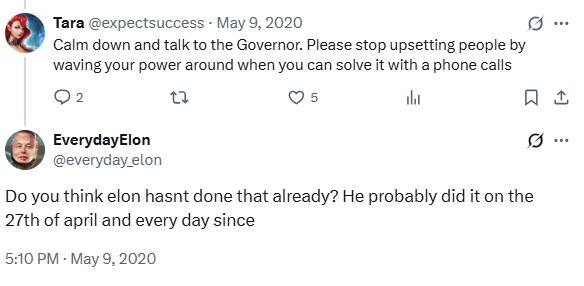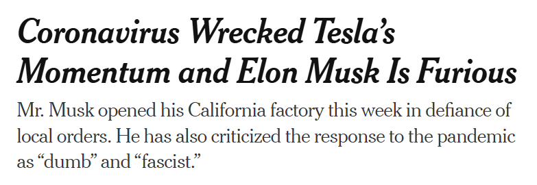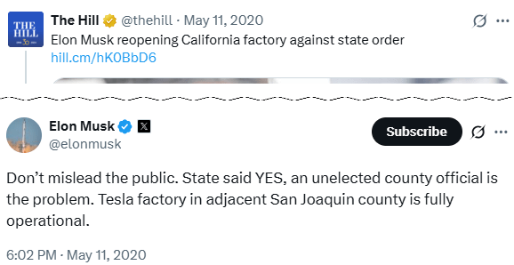 4:36 PM – Tesla restarting production. “If anyone is arrested, I ask that it only be me.”