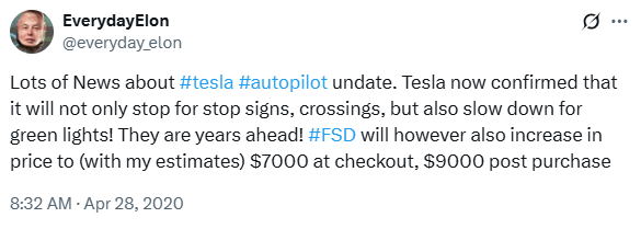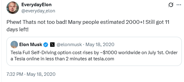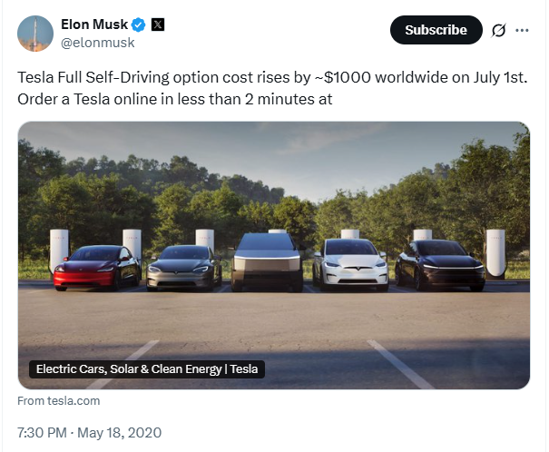 7:30 PM – Musk announces $1K FSD Price Hike effective July 1st