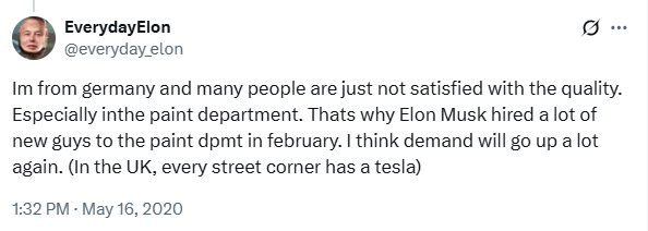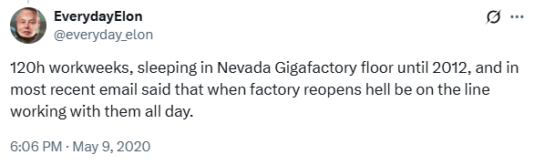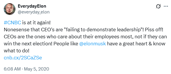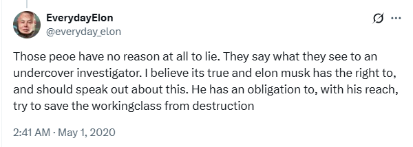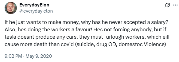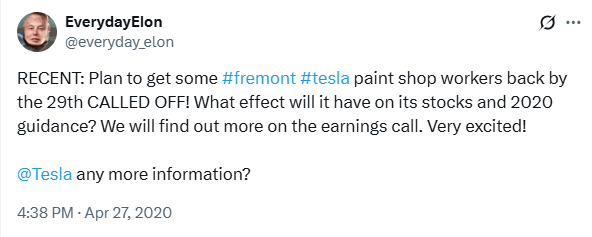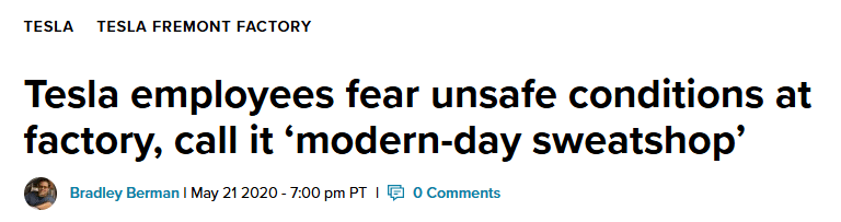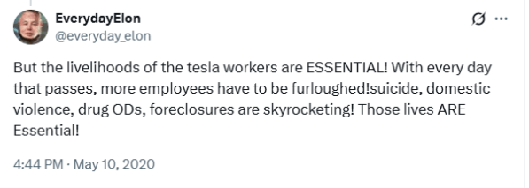 Please note: This account was created on 4/27 in order to complain to Tesla about an email sent by the Fremont Supervisor of the Paint Department telling employees not to come in (in compliance with county orders, and contradicting an email from Tesla the day before)