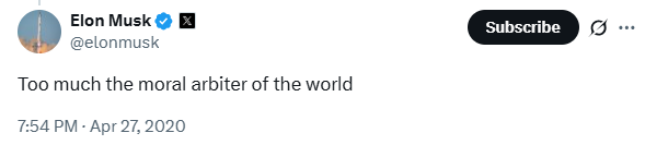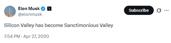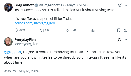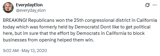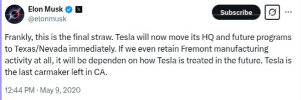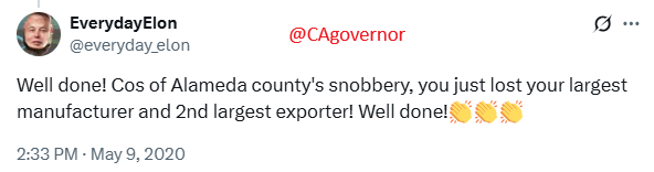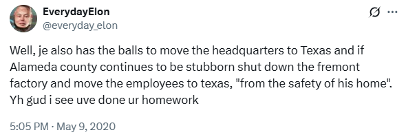 But filing a lawsuit is so mundane and slow, without the immediate gratification that Musk so sorely craves. Personally attacking some county health official also didn’t make him feel as powerful as his station in life entitles him to feel. Always consumed by the need for *now*, Musk followed up 10 minutes later to announce Tesla would be leaving California.