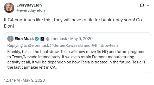 12:44 PM – Musk breaks up with California via Manic Tweet Spree