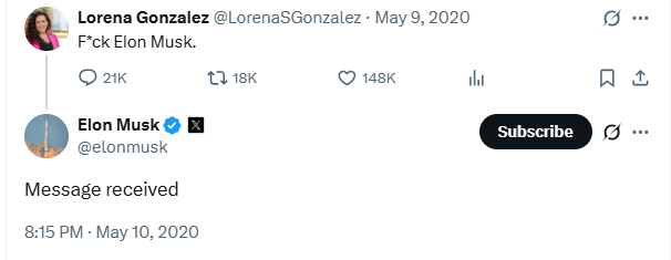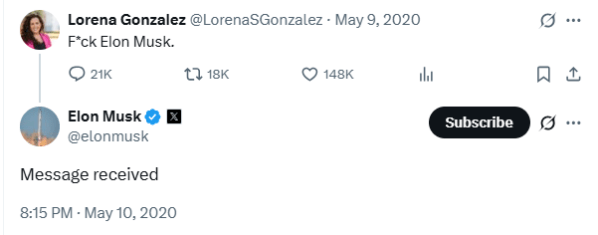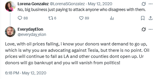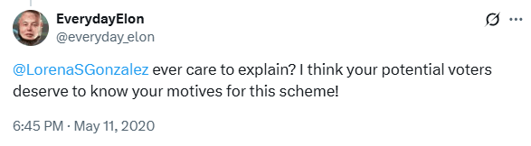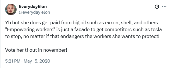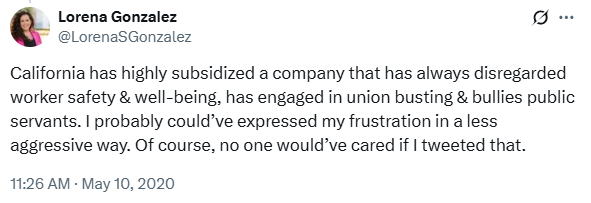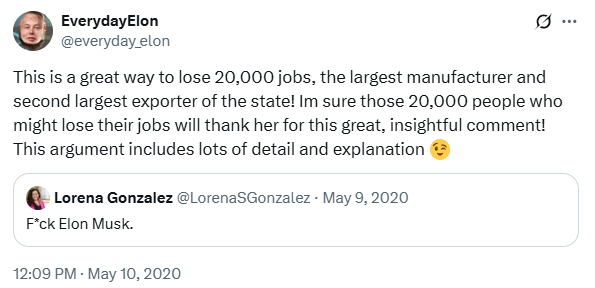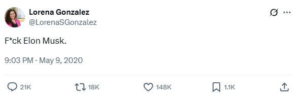 9:03 PM – Lorena Gonzalez (CA State Rep) – “F*ck Elon Musk”
