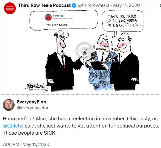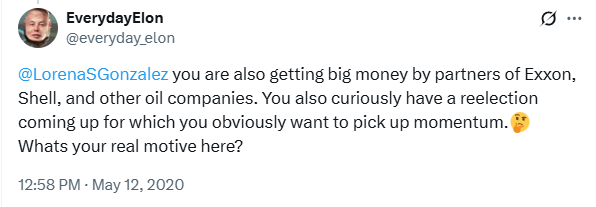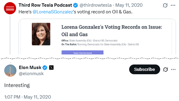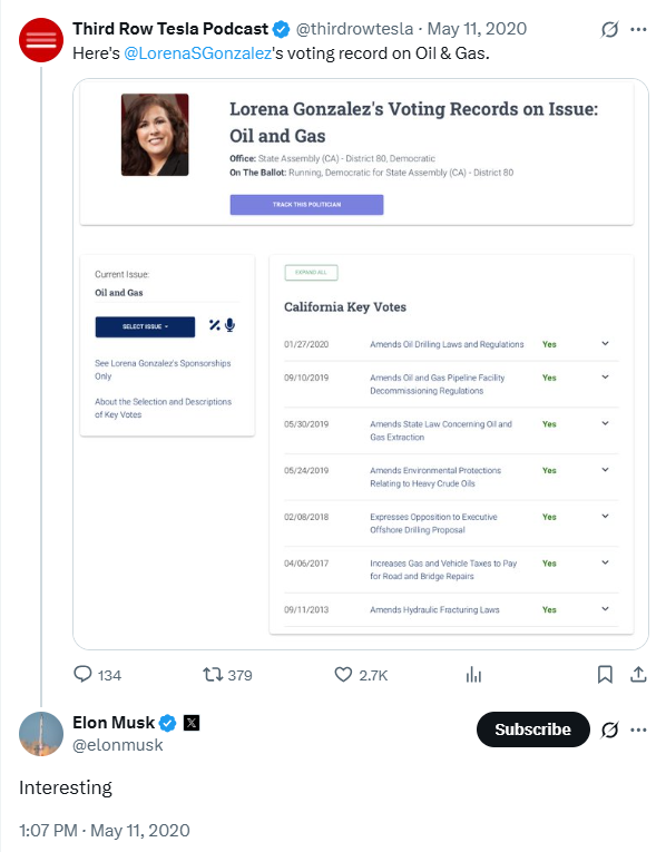 1:07 PM – “Interesting” re: Rep ‘F*ck Elon Musk’s voting record re: Oil & Gas