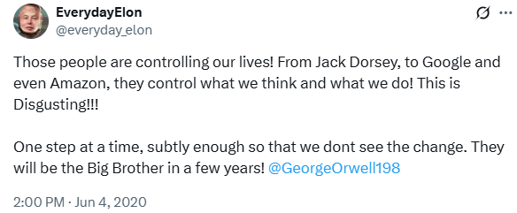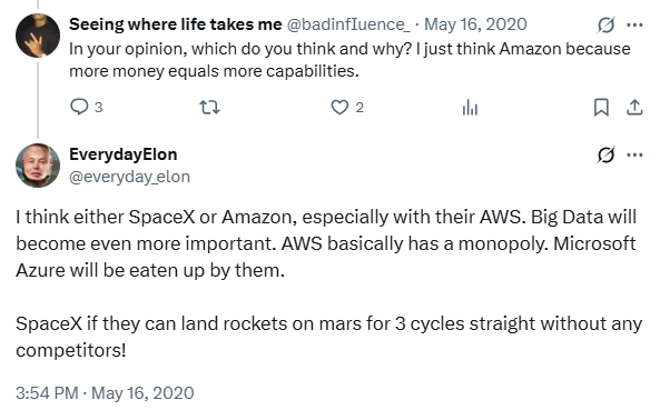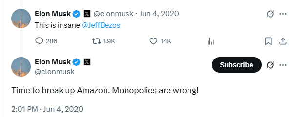 2:01 PM – Musk calls to break up Amazon. “Monopolies are wrong”