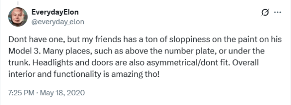 🥸 7:25 PM – Friend’s Model 3 is perfection, except for piss poor paint job