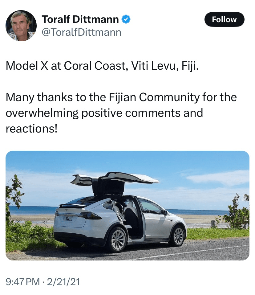 9:47 PM – Toralf Dittmann Tweets about his Tesla in Fiji 🇫🇯