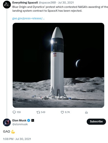 GAO Rejects Bezos Protest; NASA pays $ to SpaceX