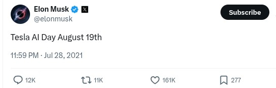 11:59 PM – Musk announces “Tesla AI Day” 8/19