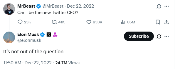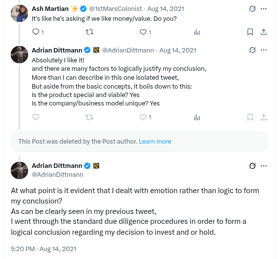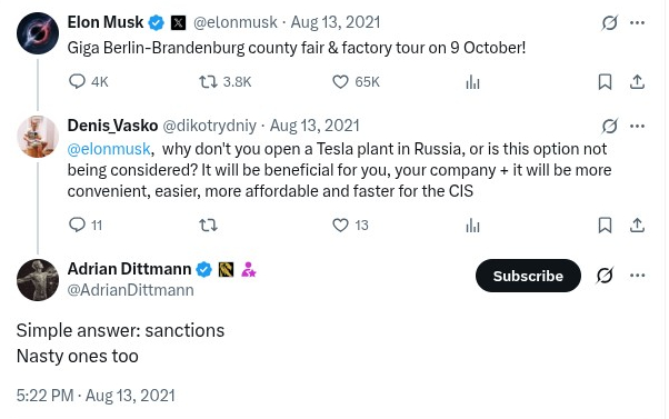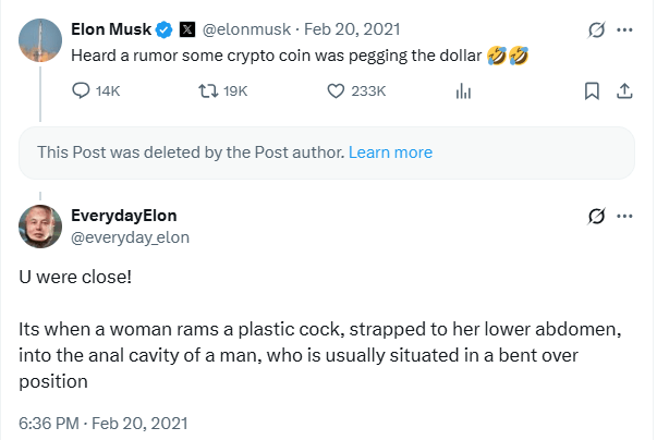 Although the posts Musk and Dittmann are replying to have been deleted, it’s worth noting that the tweets came from @alexestergaard. It appears the username has been recycled anew (Joined date – September 2022), but the new account primarily tweets in Russian, and he might be the world’s biggest asshole.