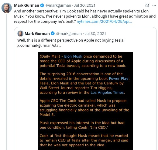 “Apple Chief Executive Tim Cook and Tesla Chief Executive Elon Musk are talking on the phone. The 2016 unveiling of the make-it-or-break-it Model 3 is coming soon, but Tesla is in serious financial trouble. Cook has an idea: Apple buys Tesla.