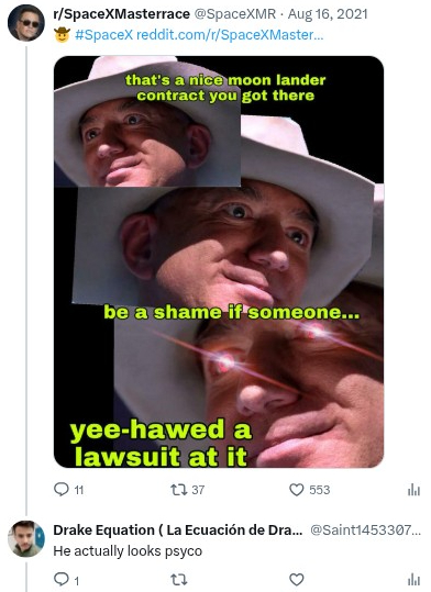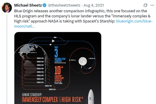 “On July 30, 2021, the GAO rejected the protests and found that “NASA did not violate procurement law” in awarding the contract to SpaceX, who bid a much lower cost and more capable system. Nevertheless, CNBC reported on August 4 that “Jeff Bezos’ space company remains on the offensive in criticizing NASA’s decision to award Elon Musk’s SpaceX with the sole contract to build a vehicle to land astronauts on the moon” and the company had produced an infographic highlighting several Starship deficiencies compared to the Blue Origin proposal, but noted the infographic avoided showing the Blue Origin bid price as roughly double the SpaceX bid price. Soon after the appeal was rejected, NASA made the contracted initial payment of US$300M to SpaceX.” (Wiki)