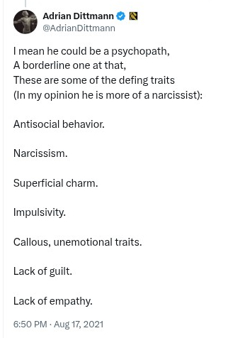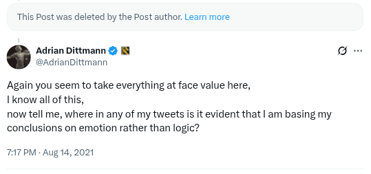 Like he does with jokes and business, he doesn’t offer anything new, he merely explains the post, going so far as “that’s about right”. As if he’s the final arbiter and nothing is real unless he’s validated it. He does this a lot. So does Adrian Dittmann.