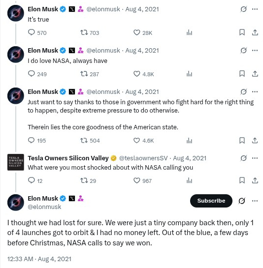 12:33 AM – Musk recounts the 2008 NASA Contract that saved SpaceX