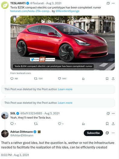 Everyone seemed to want a $25K Tesla except for Elon Musk and Adrian Dittmann. ‘Fixing to’ is what drives stocks up, and Dittmann was (for some reason) thinking about busses.