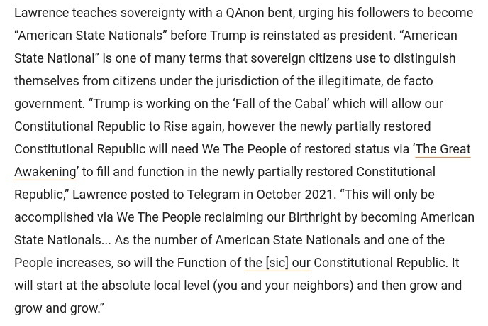 “Therein lies the core goodness of the American state” is such an odd phrasing… I don’t hear a lot of patriots referring to their country as “the American state”, but apparently it is a thing with QAnon / The Sovereign Citizens Movement.