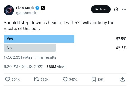 After three days of impulsive and unpopular decisions, Musk did a poll on whether he should step-down as head of Twitter and seemed genuinely surprised by the results.