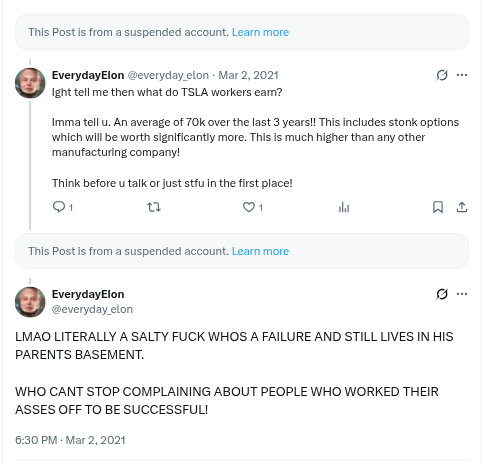 … it’s always the same thing with Musk, and how he has trained his minions. It’s not enough to dismiss his critics as haters, they must be financially motivated haters. He attributes any Tesla criticism to being the work of “short sellers”, and anyone who disapproves of his ongoing crypto pump scam must not have bought quick enough.