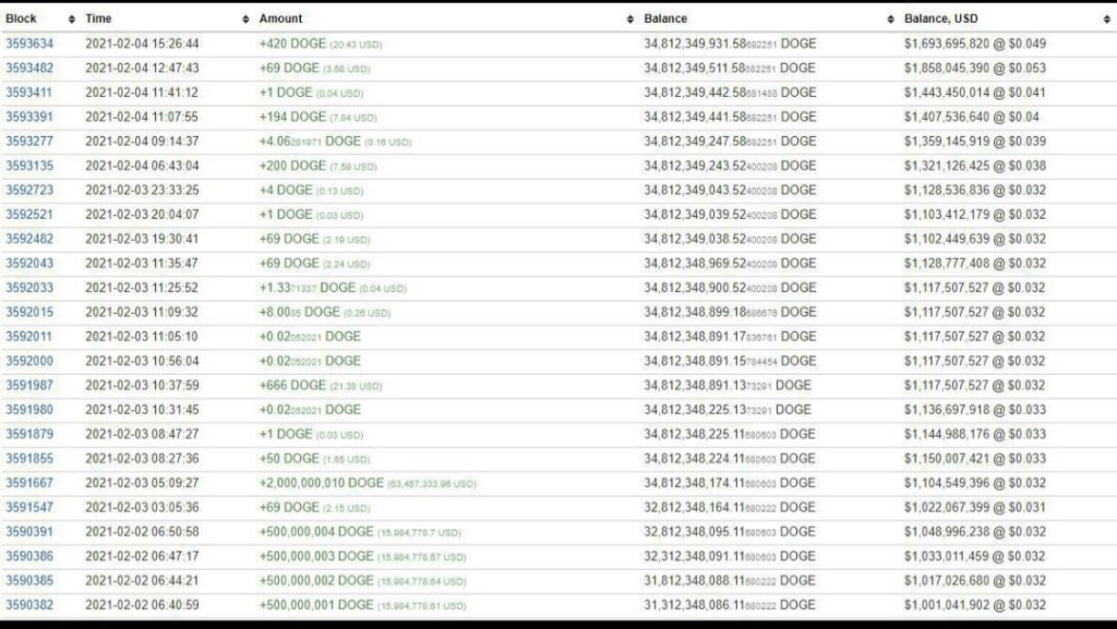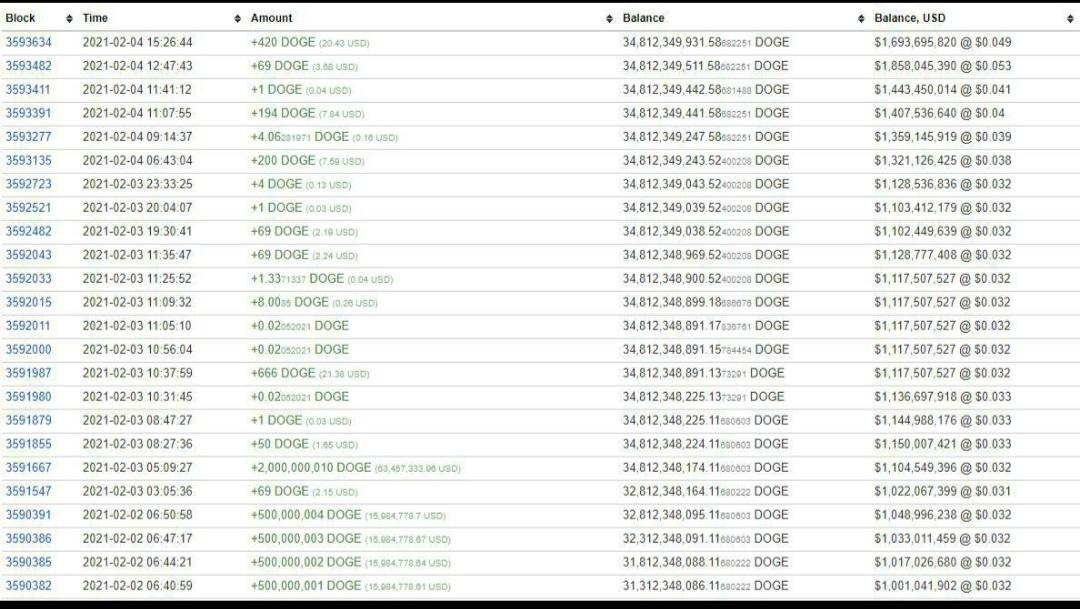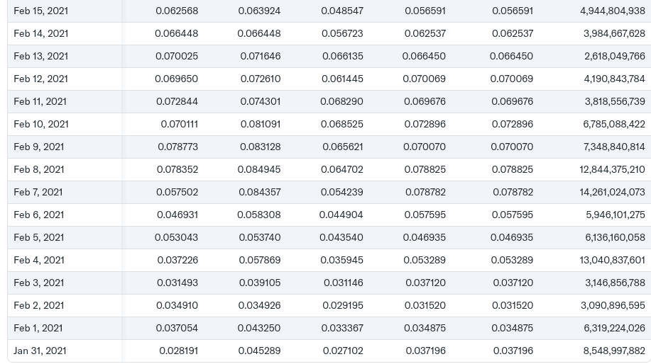 Dogecoin Data from 1/31/21 – 2/15/21: