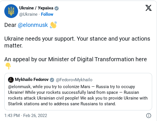 SpaceX formally requests taxpayer funding for previously donated Internet service to Ukraine 🇺🇦