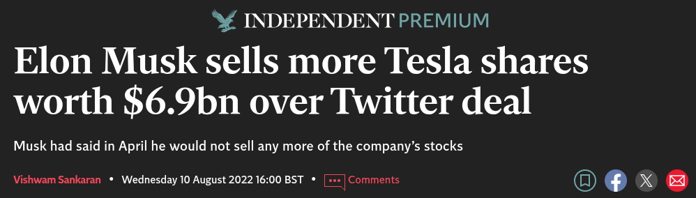 Independent – Elon Musk sells more Tesla shares worth $6.9bn over Twitter deal