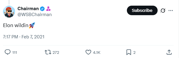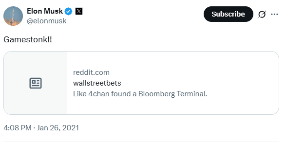 4:08 PM – “Gamestonk!”, Musk Tweets wallstreetbets Subreddit