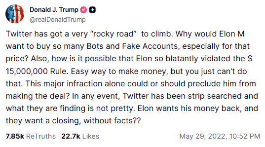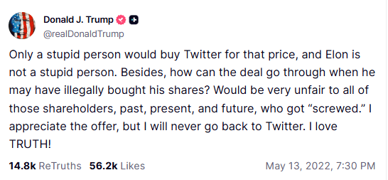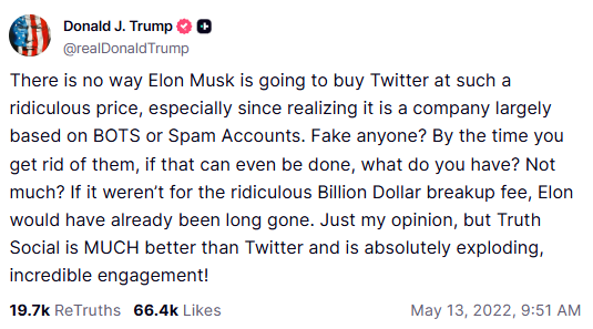 5:04 PM – TRUMP RT, “Trump Called it Again: Elon Musk Backs Out of Twitter Deal”