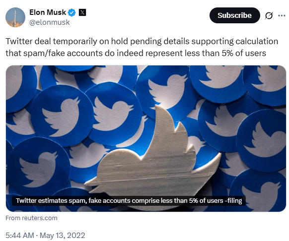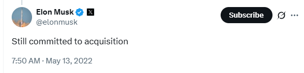 “On October 3, Musk’s legal team informed Twitter that Musk had changed his mind and decided to move forward with his proposed acquisition at the originally agreed-upon price of $54.20 per share, on the condition that Twitter drop its lawsuit. The reason for this reversal was attributed to concerns from Musk’s team that they would not be able to prove that there was a material adverse effect justifying a break from contract. Musk and Agrawal’s depositions were originally scheduled for October 6 and 10, respectively.”