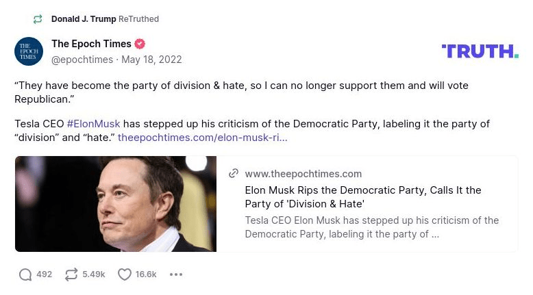 9:57 AM – TRUMP RT: Musk article about Dems being “the party of division & hate”