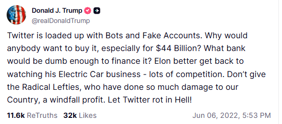 5:33 PM – TRUMP RT Article about Musk’s threatened abandonment of Twitter Deal