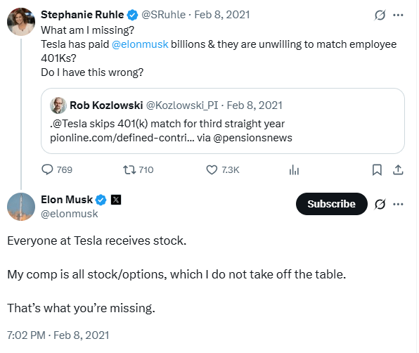 7:02 PM – Tesla doesn’t match 401Ks, employees get stock