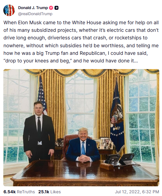 6:32 PM – TRUMP: Musk would’ve dropped to his knees at his command