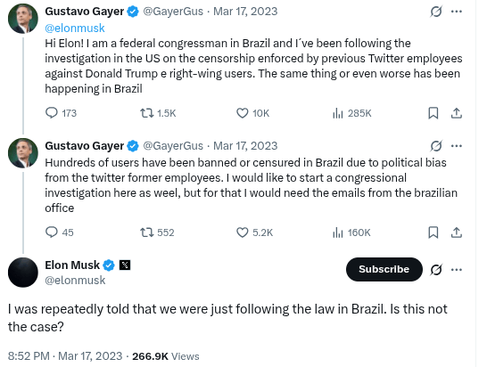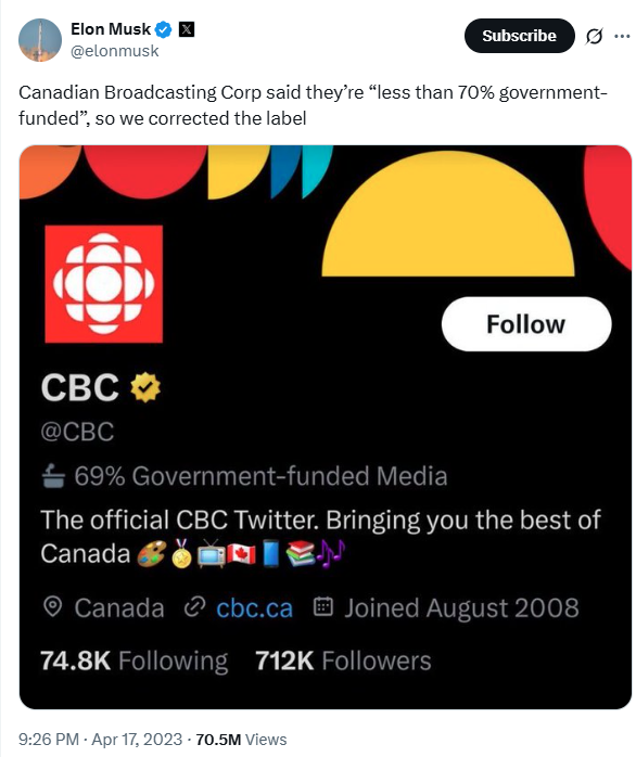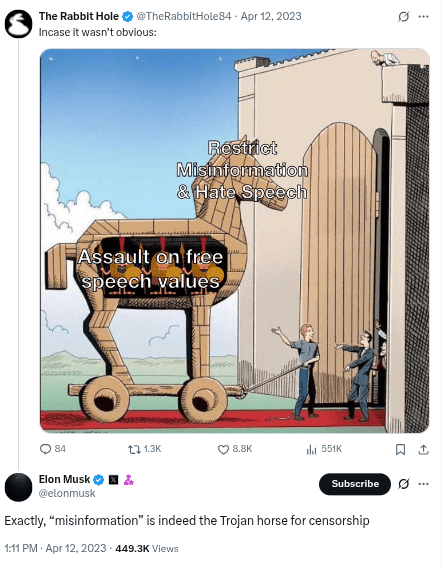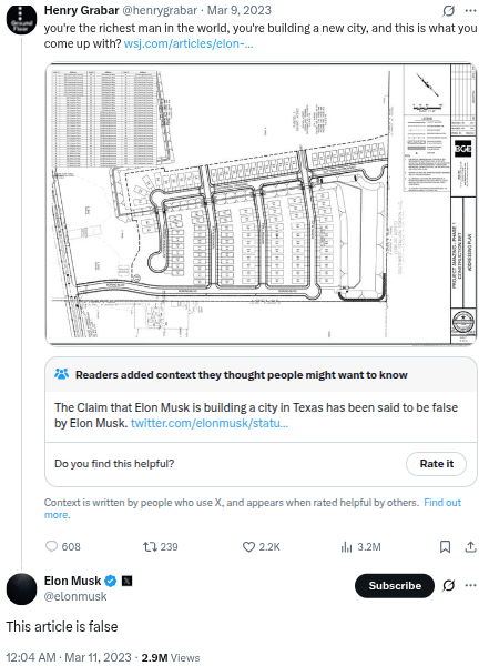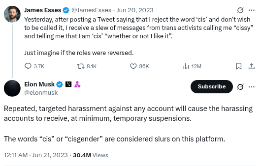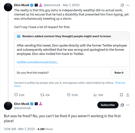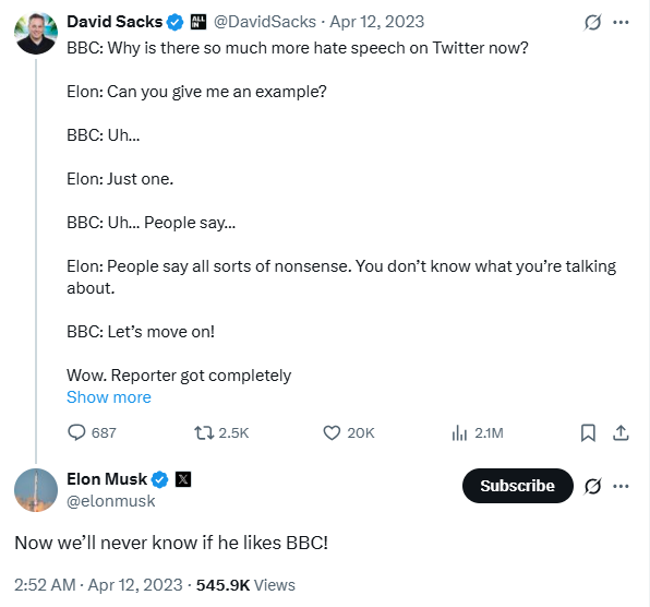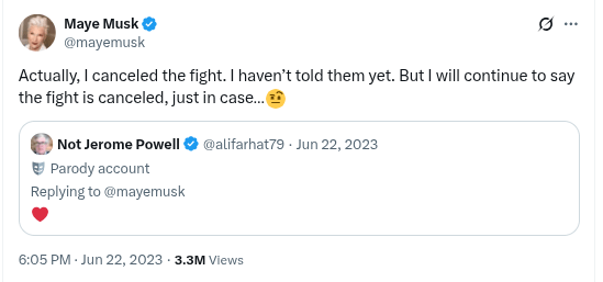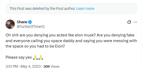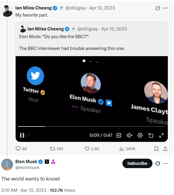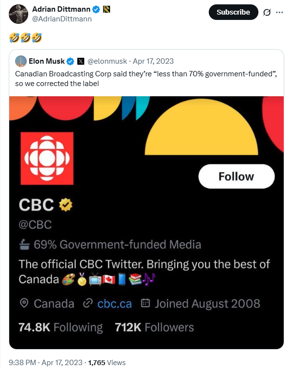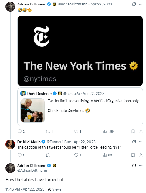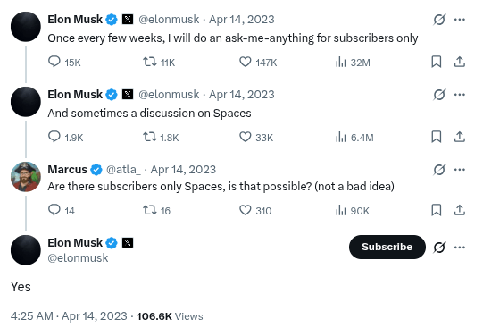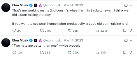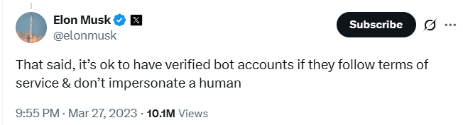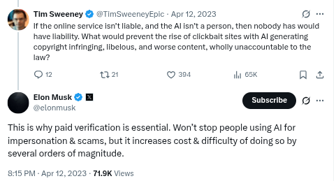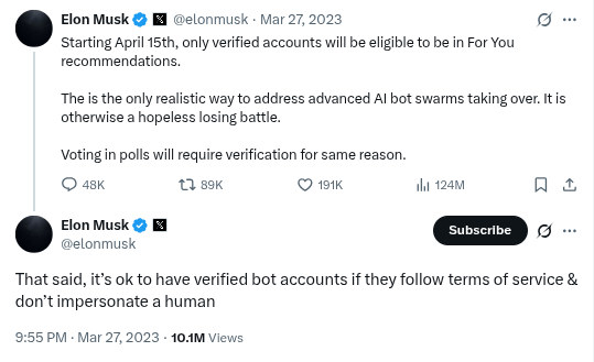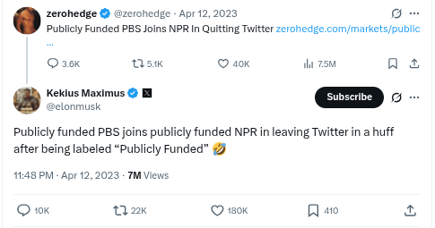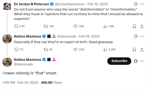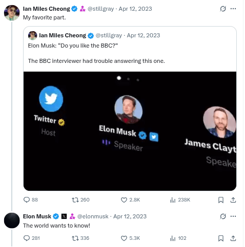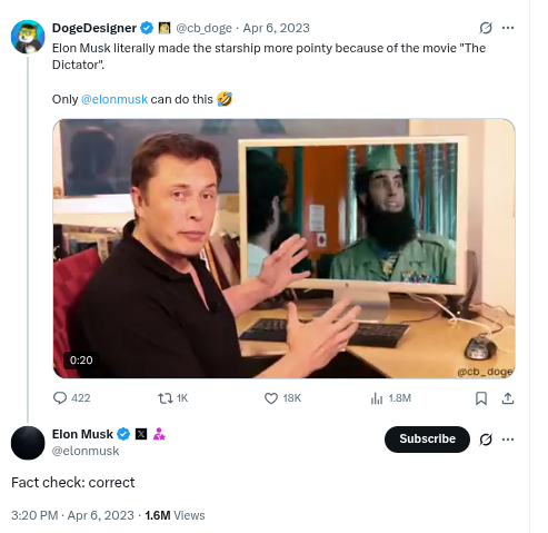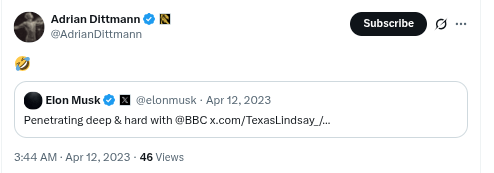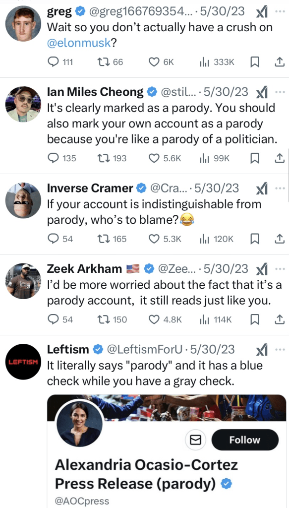 Musk (probably) knows he’s responding to a parody — but per his new blue-check rules, and moderation only applying to critics of him — it’s deliberately not obvious to a casual scroller.