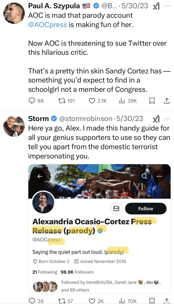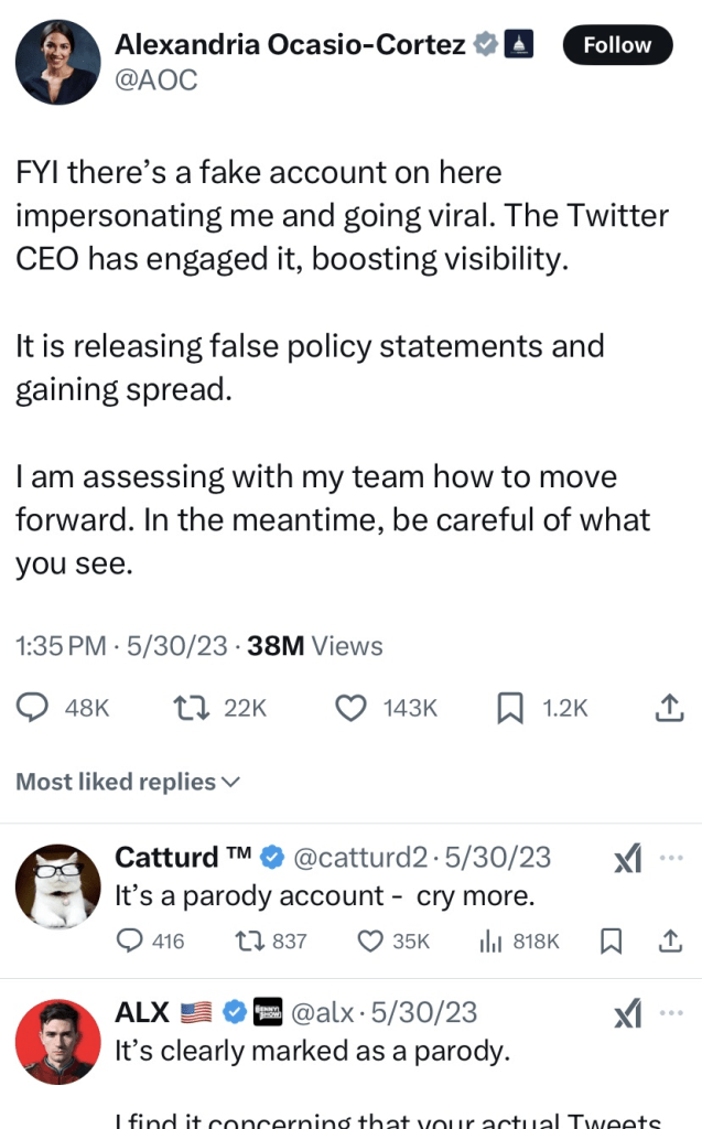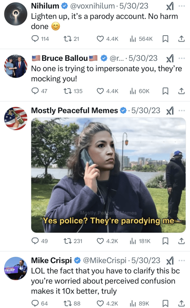 The name on the account is deliberately long, so that the (parody) that comes at the end isn’t going to be visible on the app or most browsers, and someone would have to click to the profile in order to see the designation.