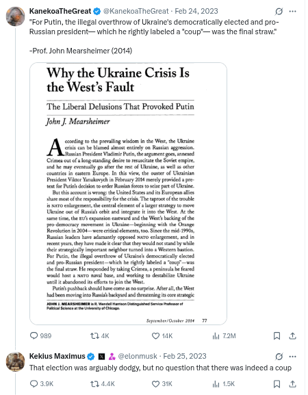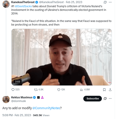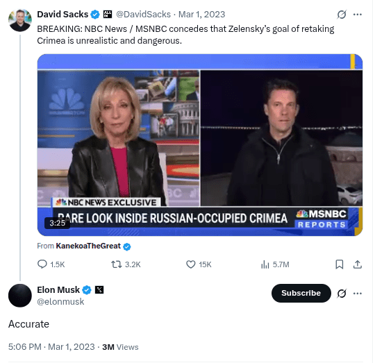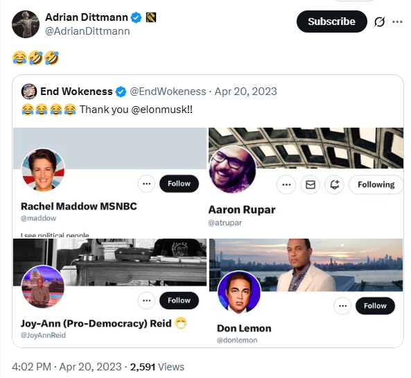 The account he RT’s to bolster his inflammatory claim is Matt Taibbi — the same man Musk entrusted to take his “Twitter Files” and pretend there was something revelatory or damning in them.