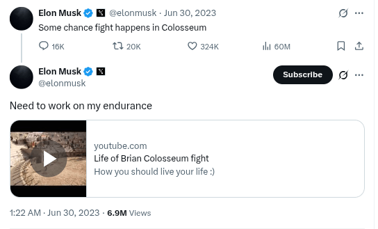 1:22 AM: Musk proposes Colosseum for Zuckerberg fight