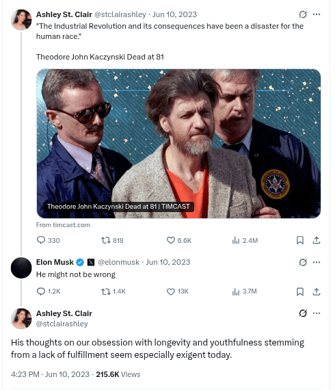 Musk and Ashley St. Clair bond over how right the Unabomber was