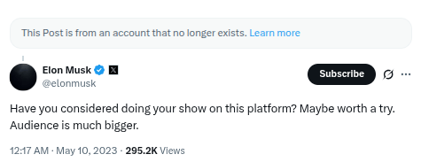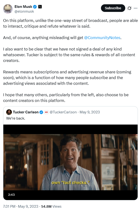 Musk promotes Tucker Carlson show, appeals to “others” to post