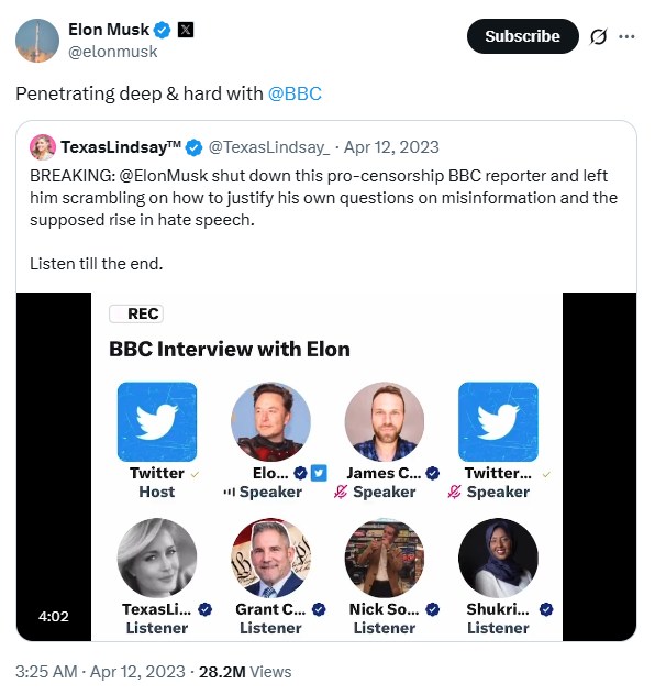 10:47 AM – Musk boosts AOC Parody Account, invites new wave of sexual harassment