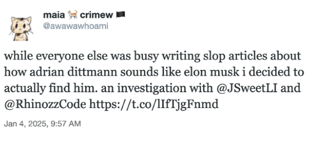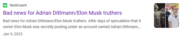 In order for the Dittmann scam to continue working, Musk needs people ‘in the know’ to know it’s him, but he also needs conventional wisdom to say he’s someone else.