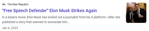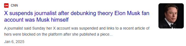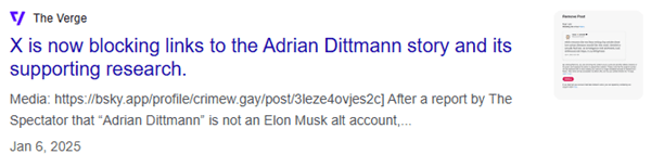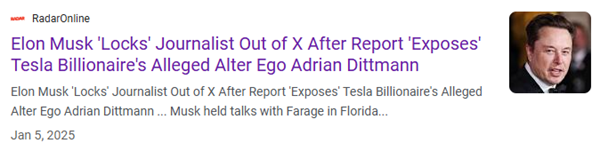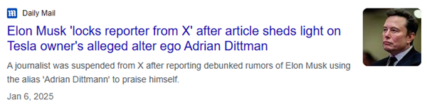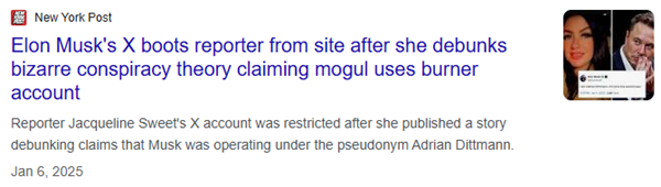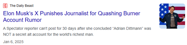 The story appeared just as Musk needed it the most. He had spent the week between Christmas and New Years Eve in a narcissistic, (allegedly) drug-fueled meltdown. He targeted Laura Loomer specifically, but went pretty scorched earth on MAGA in general. As Elon, he banned a score of accounts and, as Adrian, he took to Spaces to try and justify it.