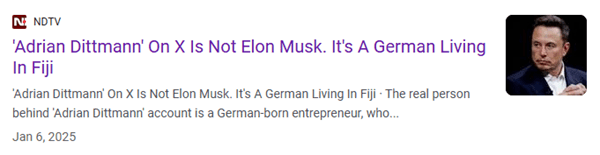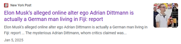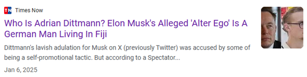 All in all, the big scoop on Dittmann, as presented by Maia or as filtered through Jacqueline Sweet – is that Adrian Dittmann, son of Toralf Dittmann, is a real guy living in Fiji, and I maintain that Elon Musk is borrowing his identity. Nothing in either the blog entry or the Spectator story disproves what I can hear with my own ears.