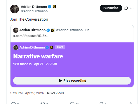 (9:29 PM -11:10PM) – Adrian Hosts Space – “Narrative Warfare”